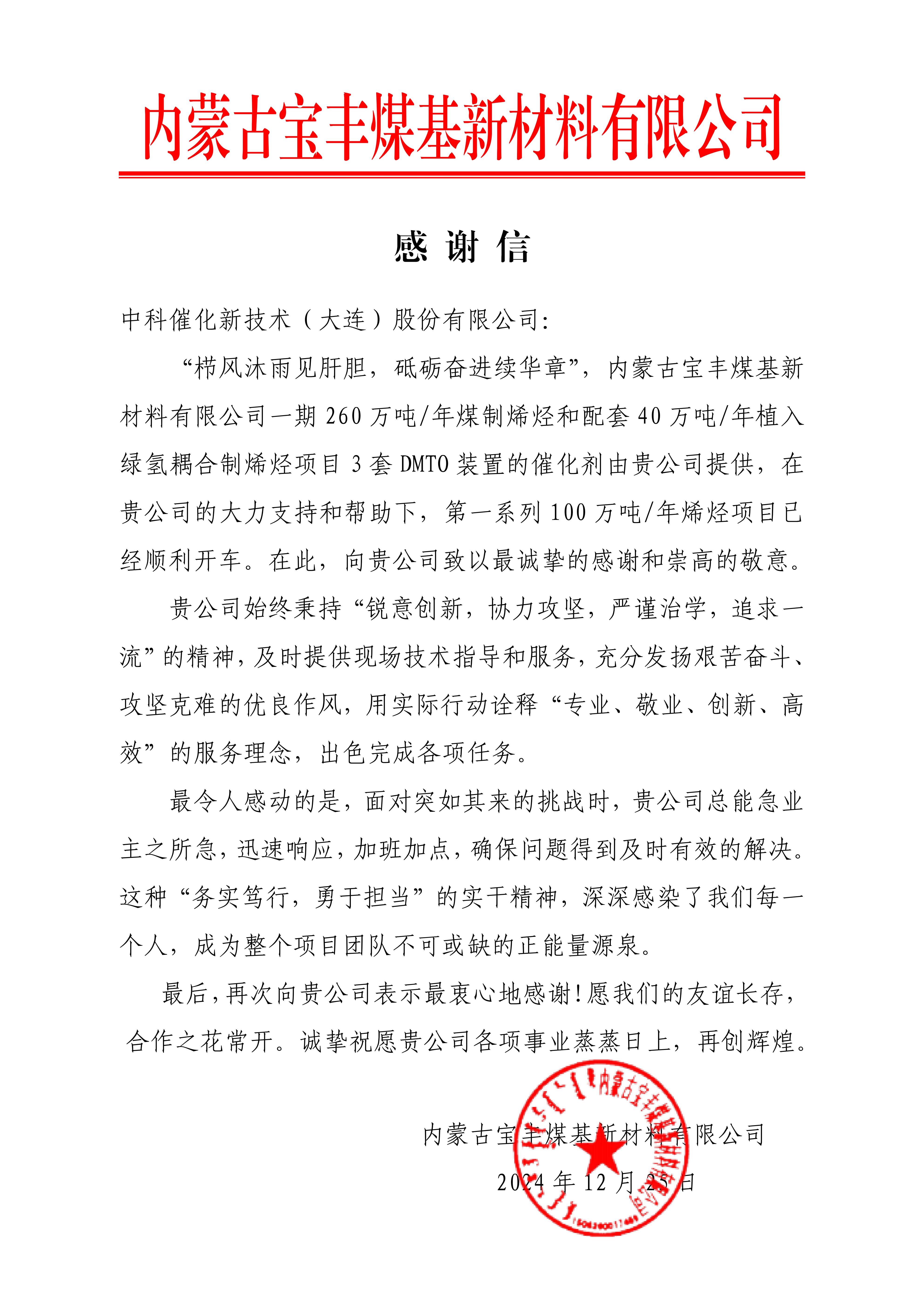 2024年12月25日,我公司收到由內(nèi)蒙古寶豐煤基新材料有限公司發(fā)來(lái)的感謝信。信中,客戶(hù)對(duì)我公司在其烯烴項(xiàng)目中給予的支持,表達(dá)了誠(chéng)摯的謝意。