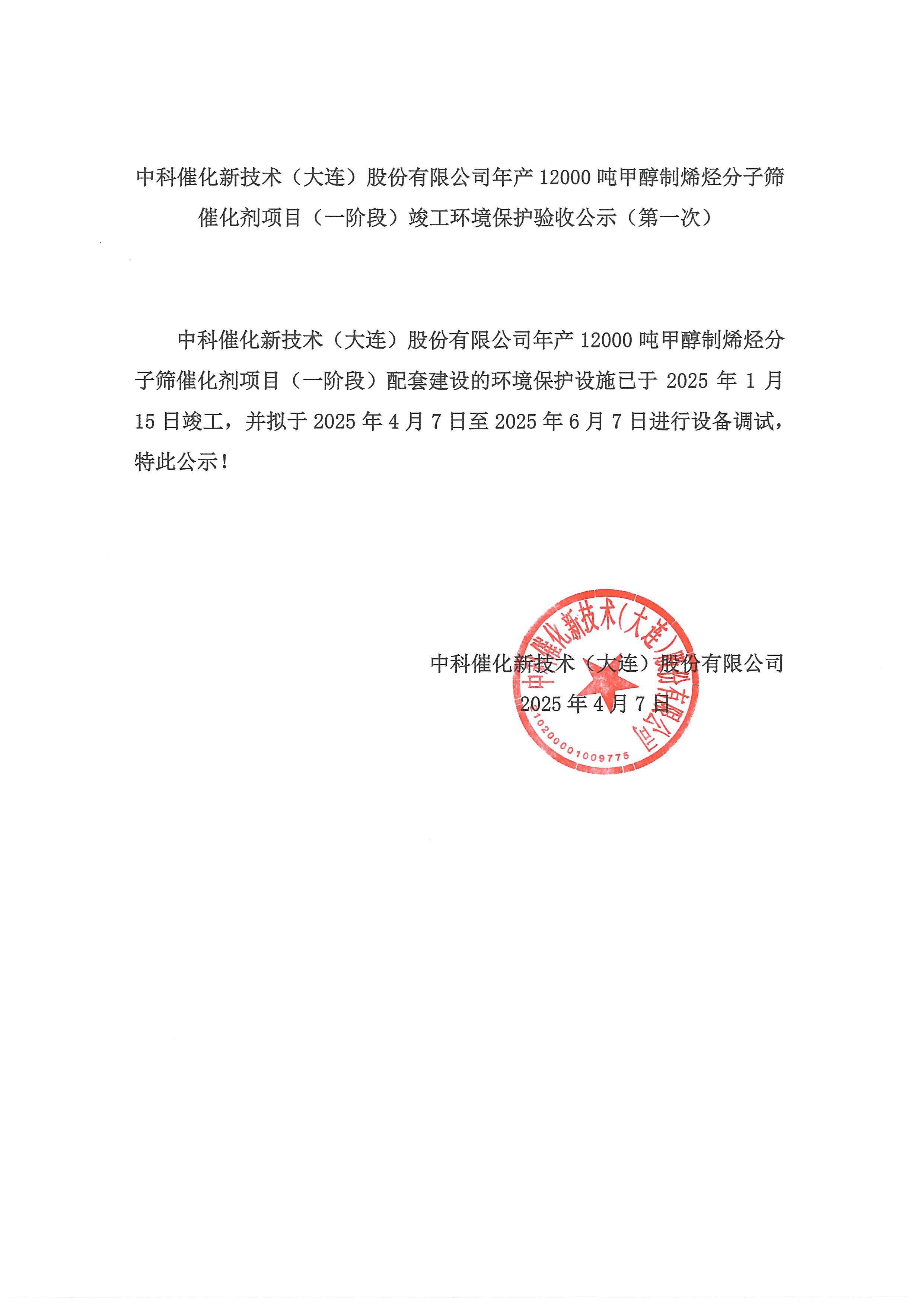 中科催化新技術(shù)(大連)股份有限公司年產(chǎn)12000噸甲醇制烯烴分子催化劑項(xiàng)目(一階段)竣工環(huán)境保護(hù)驗(yàn)收公示(第一次)
