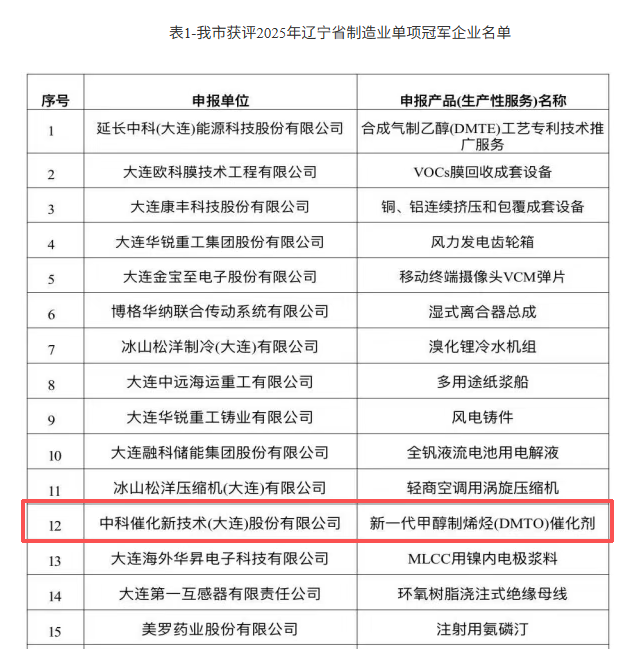 近日,遼寧省工業(yè)和信息化廳公示了2025年遼寧省制造業(yè)單項冠軍企業(yè)認定名單,中科催化新技術(shù)(大連)股份有限公司(以下簡稱“我司”)憑借主導(dǎo)產(chǎn)品“新一代甲醇制烯烴(DMTO)催化劑”成功入選。該認定歷經(jīng)各地市初審?fù)扑]、專家評審等多輪嚴格篩選,是對企業(yè)在細分產(chǎn)品領(lǐng)域的市場地位、技術(shù)實力、創(chuàng)新能力和品牌影響力的高度認可。