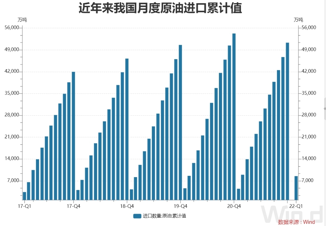 如圖所示,除2021年以外,近年來我國原油進口均呈現(xiàn)逐年升高的趨勢